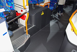 藤井さんに、さらに「エルガ」の運転席など、新しくなった部分についてうかがいました。「AMT(機械式自動変速マニュアルトランンミッション)操作レバーのカバーを小さくしたり、運賃箱の位置を見直すなど、細かな工夫によって運転席のスペースを若干広げて運転環境を改善しています。また、お客様の座席では一部足乗せ台の見直しも行い、膝前を広げて居住性を確保しました。それに、このモデルからヘッドランプにLEDランプを採用して、視認性の高さに加え、ロングライフ化を実現しました。」