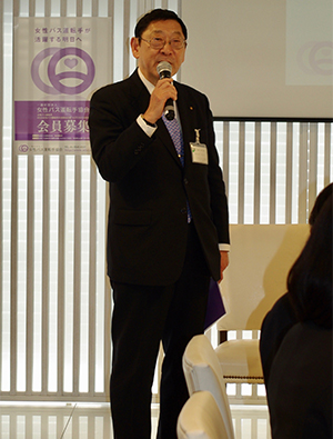 続いて、当協会(日本バス協会)の常務理事である船戸裕司が登壇。「現在は乗合バスが約6万台、貸切バスが約5万台という中で、運転手は乗合バスが約8万4千人、貸切バスが約4万9千人となっており、男性の運転手が多い状況です。昔はパワステなどもない時代で、大型のバスの運転にはたいへんな苦労もあったと思います。しかし時代とともに車両や技術が進化し、運転に対するサポートも向上してきています。これからはさらに多くの女性の方々に大型二種免許を取得していただき、ともにバス業界を支えていただけたらと思います」と語りました。