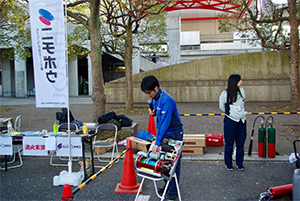 プレゼンステージの横では、株式会社ニチボウによる、エンジンルーム自動消火装置の実演が行われました。万一のエンジンルームの火災、電池火災、燃料火災など、あらゆる火災を急速消火する電源不要の「ウォーターミスト消火システム」を紹介。迫力のある炎と瞬時に消火される様子を目の当たりにし、多くの人の感心する表情が見られました。